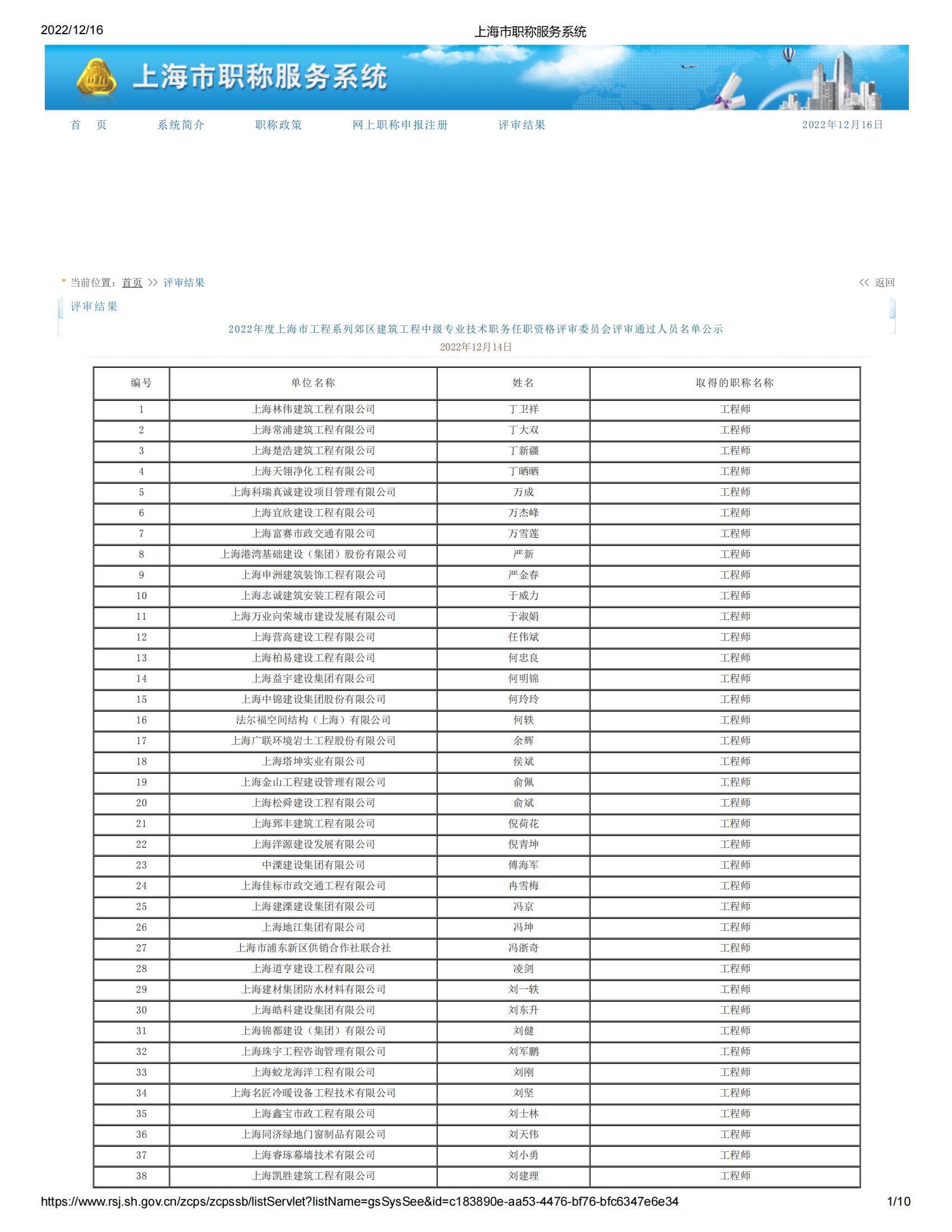 2022年度上海市工程系列郊區建筑工程中級專業技術職務任職資格評審委員會評審通過人員名單公示